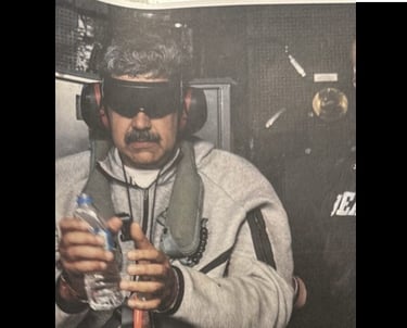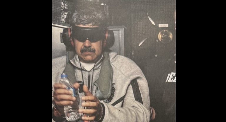 Poucas horas depois de Trump anunciar, em sua rede social, que forças americanas haviam capturado o presidente venezuelano, uma fotografia passou a circular com força viral. Nela, Maduro aparece vestindo calça de moletom cinza, com as mãos algemadas à frente do corpo e os olhos cobertos por uma venda escura.