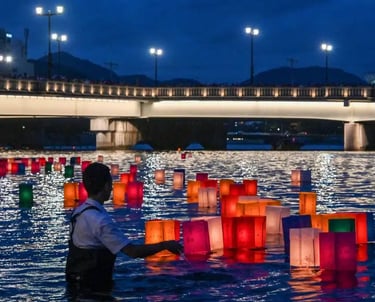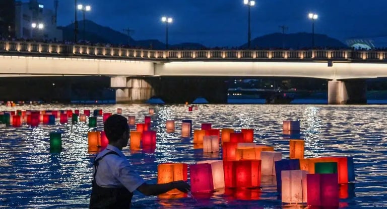 Voluntário acende lanternas no rio Motoyasu, durantes os 80 anos da bomba em Hiroshima/Foto: Richard A. Brooks/AFP