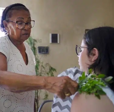 Essa leitura encontra correspondência direta em práticas ancestrais que operavam, há gerações, sobre esse mesmo campo. Benzedeiras nordestinas — mulheres reconhecidas em suas comunidades como agentes populares de cura, guardiãs de saberes transmitidos oralmente — desenvolveram um conjunto de gestos e rituais que, à primeira vista, poderiam parecer simples, mas que revelam uma lógica precisa. O uso do galho de arruda, por exemplo, seguia movimentos repetitivos sobre o corpo, acompanhados por orações em ritmo constante. O efeito combinado desses elementos criava um ambiente de previsibilidade sensorial, condição essencial para reduzir estados prolongados de tensão.