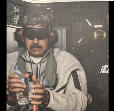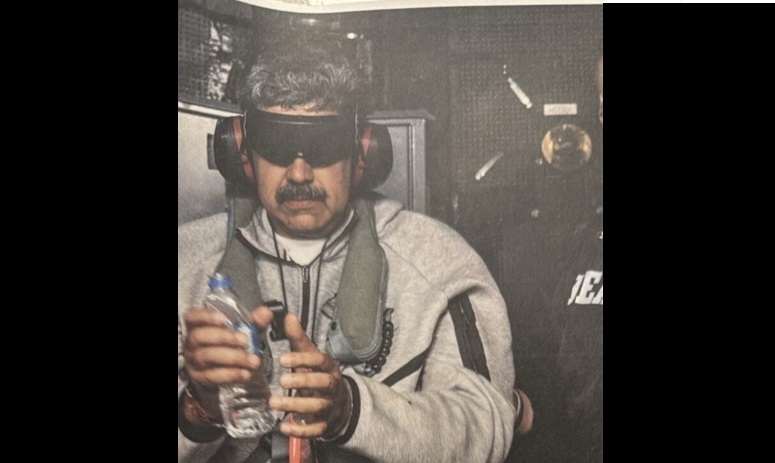 Poucas horas depois de Trump anunciar, em sua rede social, que forças americanas haviam capturado o presidente venezuelano, uma fotografia passou a circular com força viral. Nela, Maduro aparece vestindo calça de moletom cinza, com as mãos algemadas à frente do corpo e os olhos cobertos por uma venda escura.